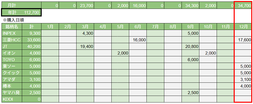 そのあとは買う機会もなく10月にKDDIを新規購入しただけで終了しました。