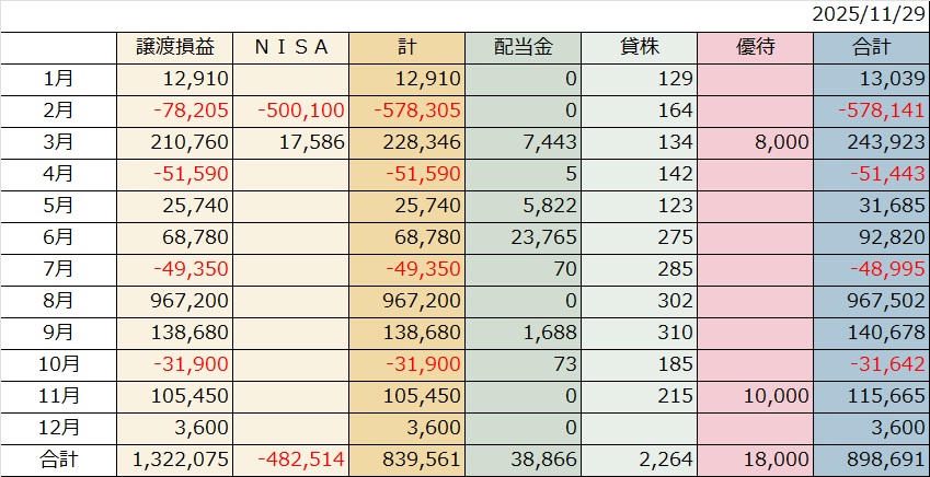 2025年11月29日までの取引・配当金・優待・貸株は?
