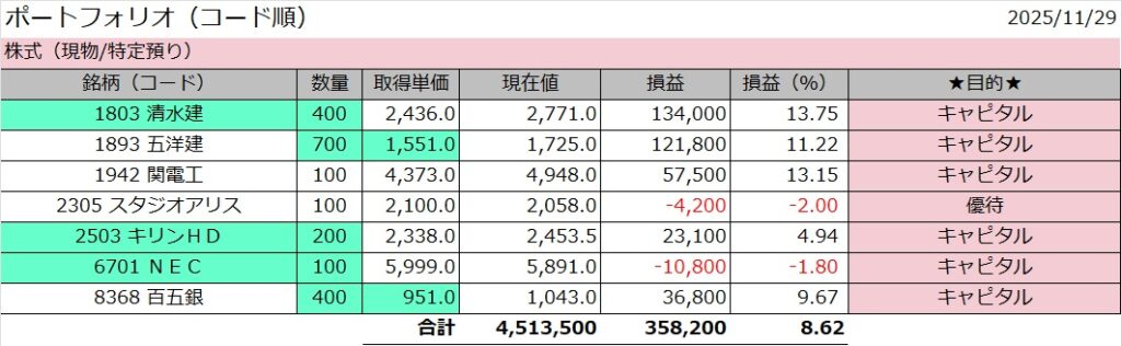 主婦投資家、ワーママ投資家の端くれであるハレバレちゃんが結婚前に貯めたお金(個人資産)で運用している株式を2025年11月29日現在の保有銘柄および損益をすべて公開します。