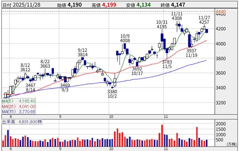 11月は4日に52,636円を付けたのをピークにズルズルと下げました。ようやく11月の最終週に入って反発、月末には50,253円となんとか50,000円奪還したところです。
