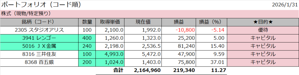 今回は2026年1月の個別株をまとめました。