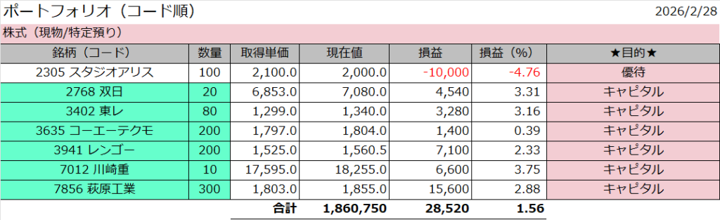 主婦投資家、ワーママ投資家の端くれであるハレバレちゃんが結婚前に貯めたお金(個人資産)で運用している株式を2026年2月28日現在の保有銘柄および損益をすべて公開します。