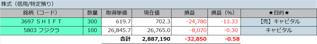 あとはフジクラをロングで入っています。こちらは分割が発表されていますね。日経同様に跳ね返されているので、もしかしたら結構やられるかもしれません。今度こそ長期で持ちたいのですが…。