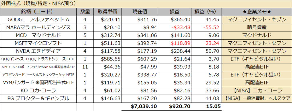 マグニフィセントセブンやらのいわゆるハイテク銘柄は冴えない展開が続きますが、今月はマクドナルドコカ・コーラPGなどのいわゆるバリューが好調でした。