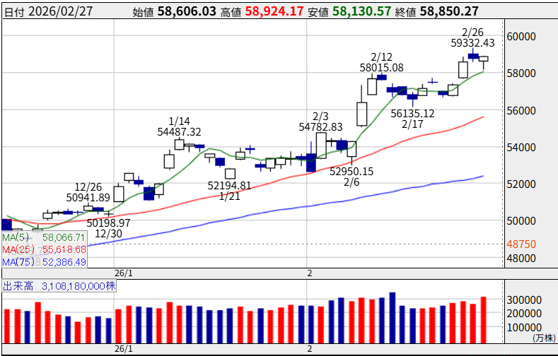 2月も日経は信じられないくらい強くて、2月26日には先物ベースではありますが6万円をつける局面もありました。