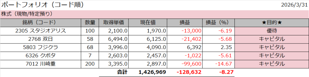 2月末保有銘柄はほとんどを損切りしました。双日と川崎重工のみ継続です。双日は少しずつ買い増していますが、川崎重工はこれ以上は増やせないので様子見しています。