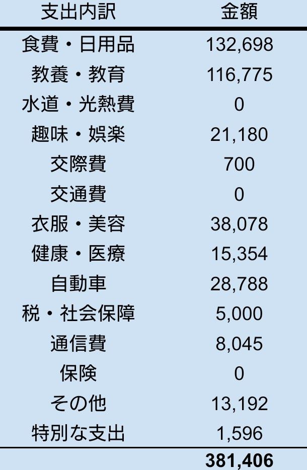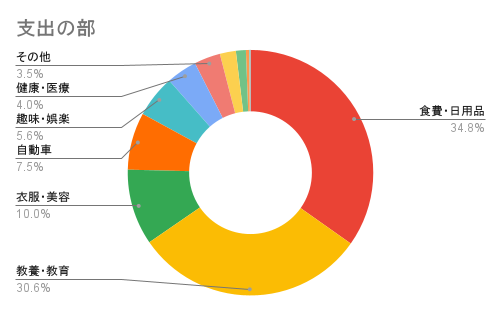 先月の車検代がなくなったので、我が家の支出二大巨頭の「食費・日用品」と「教養・教育」が6割以上を占めています。