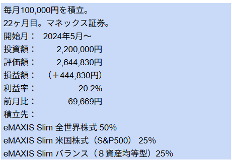 曇ちゃんの方は同額積立中のS&P500と8資産均等型ですが、初めて8資産均等型が上回りました。